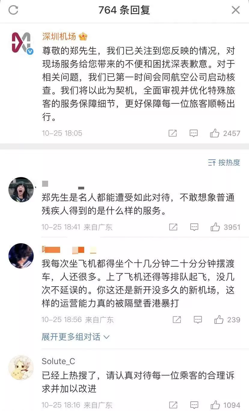 深圳机场在下午六点的时候在郑智化账号下留言,表示已经关注到他反映的情况,对现场服务给他带来的不便和困扰深表歉意,对于相关问题,他们已经第一时间会同航空公司启动核查。他们将以此为契机,全面审视并优化特殊旅客的服务保障细节,更好保障每一位旅客顺畅出行。