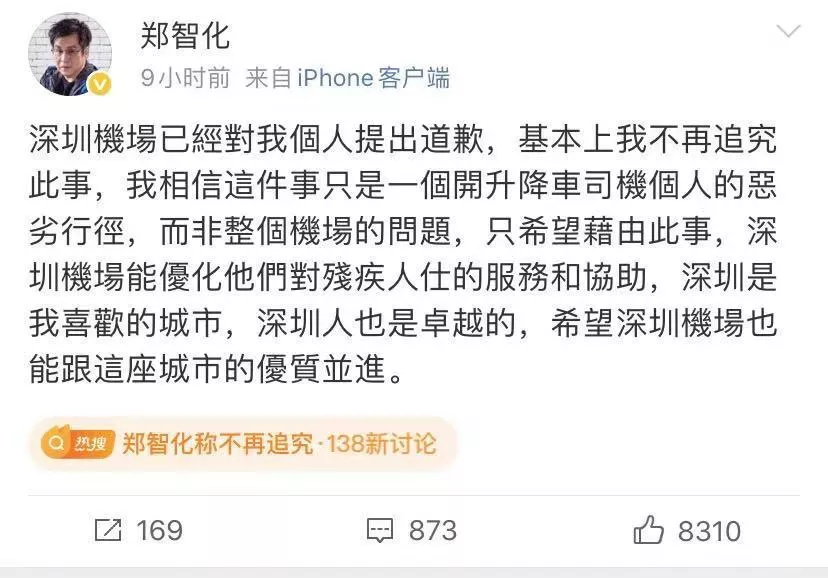 因为郑智化发了微博,所以这件事很快就曝光了,并且上了热搜,当然深圳机场的道歉也上了热搜。深圳居住的人很多都是来自各地的移民,应该是一座包容性很大的城市,而且他们的城市管理也很现代化,想不到机场出现这种事,郑智化不是找茬,应该是给机场更好的建议,机场已经关注到这件事,所以会给出满意的答案。