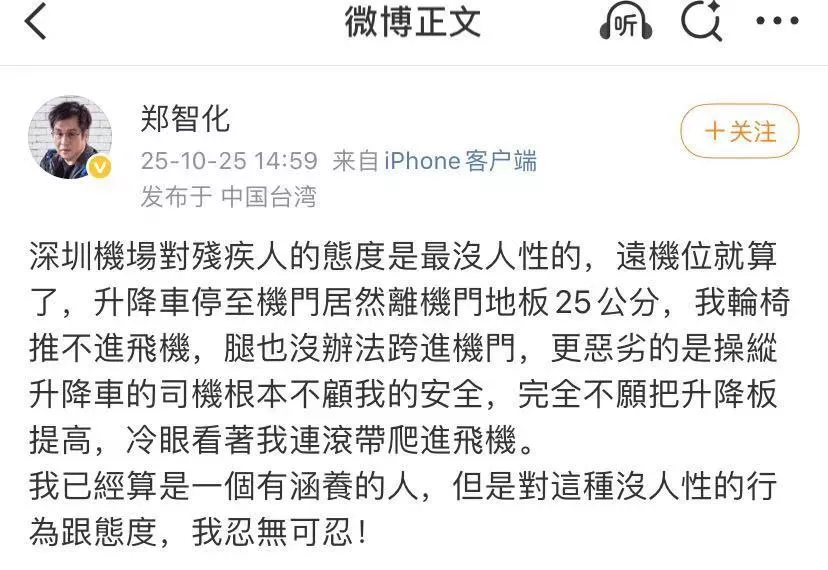 郑智化在昨天下午发文吐槽深圳机场,表示对残疾人的态度是没人性的,远机位就算了,升降车停至机门居然离机门地板25公分,他的轮椅推不进飞机,腿也没办法跨进机门,更恶劣的是操纵升降车的司机根本不顾他的安全,安全不顾把升降板提高,冷眼看着他连滚带爬进飞机。