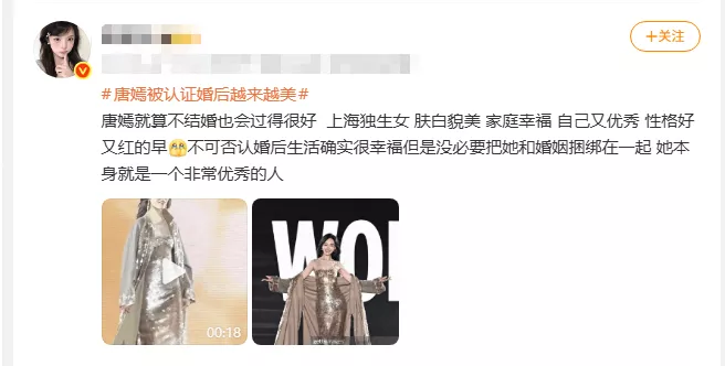 这段视频一经发布就引发了网友热议,有网友觉得唐嫣和罗晋确实婚姻甜蜜,但也有很多人觉得,女艺人的成功不应该和婚姻、丈夫等捆绑在一起,唐嫣状态好是因为唐嫣自己本身就是个足够优秀的人。