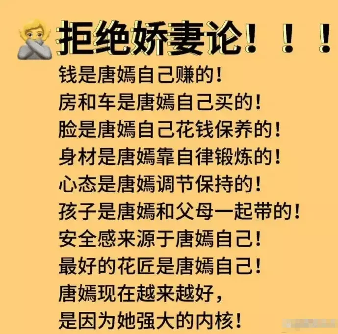 于是唐嫣的粉丝开始在各大社交平台发声,表示要“拒绝娇妻论”。
