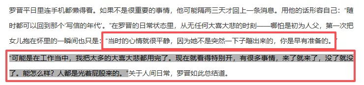 2020年10月,罗晋在采访中回应了女儿诞生一事,他表示自己“无大悲无大喜,因为已经准备了10个月,可能在工作当中把自己的大悲大喜都用完了,有很多事情来了就来了,没了就没了,又能怎么样?人都是光着屁股来的”。