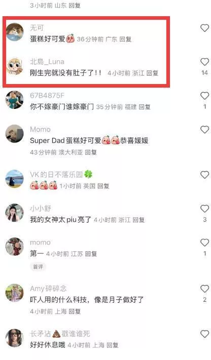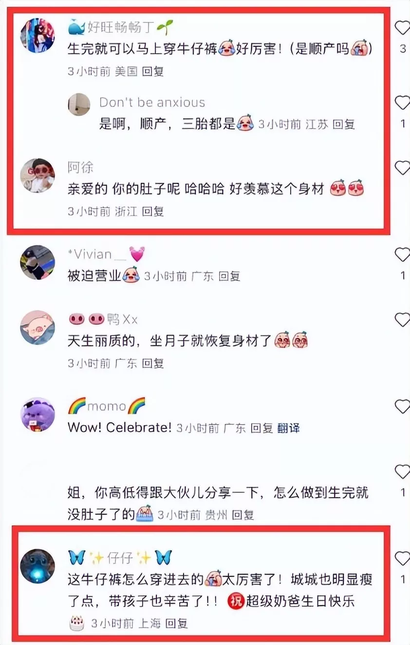 不少网友在评论区表达了对她身材恢复的惊叹和赞美。有网友说:“蛋糕好可爱。”也有人关注到她的身材,留言道:“刚生完就没有肚子了!!”“生完就可以马上穿牛仔裤好厉害!(是顺产吗)”“好旺畅畅丁:生完就可以马上穿牛仔裤好厉害!(是顺产吗)”“亲爱的,你的肚子呢,哈哈哈,好羡慕这个身材。”