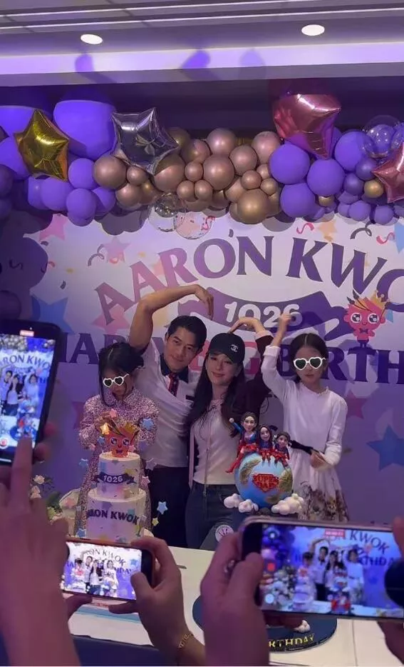 从照片中能够看到,一家四口温馨合照,刚刚出生的宝宝应该还待在月子中心被照顾着。生日现场布置得十分用心,背景墙上写着“AARON