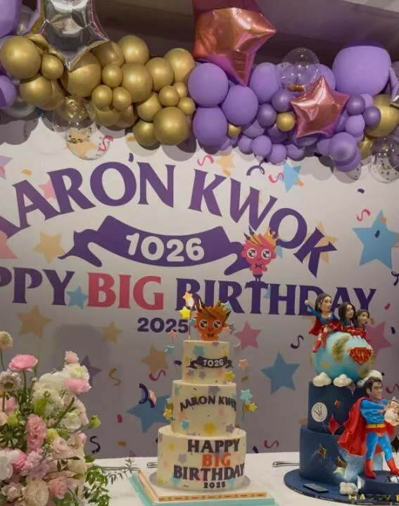 KWOK 1026 HAPPY BIG BIRTHDAY 2025”,周围装饰着紫色和金色的气球,营造出欢乐的氛围。