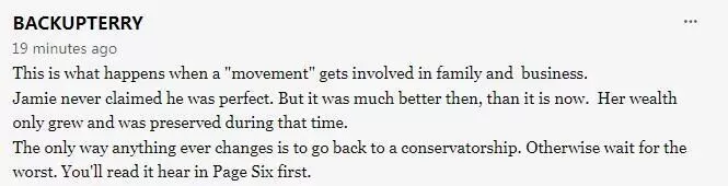 当一个“运动”涉及到家庭和生意时就会发生这样的情况。杰米从没有说过自己是完美的,但那时的情况比现在好得多。在那段时间里,她的财富只增不减。唯一能改变一切的办法就是回归监护。否则就等着最坏的结果吧。