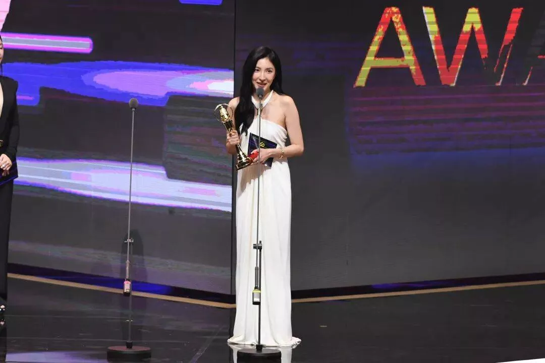 她穿着一条简约的白色礼服走上舞台笑着说:“谢谢金钟奖,谢谢评审们——我真的觉得你们这次的眼光非常好。”