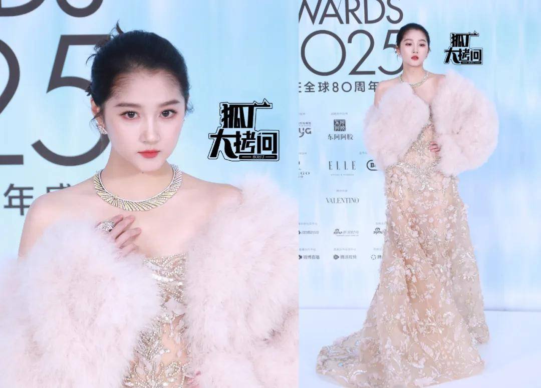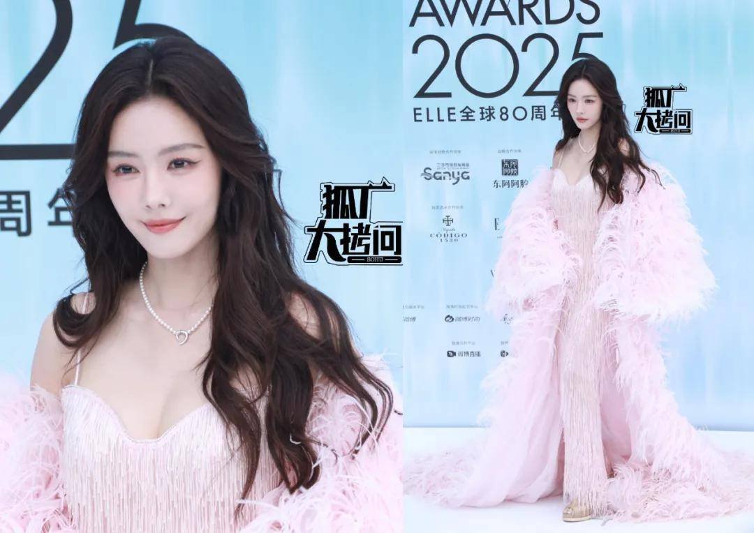 蔡文静穿了一套粉色流苏长裙,外加一件羽毛拖尾外套,无论是妆发还是造型,都甜美中带一点网红感。