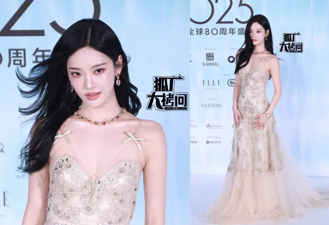 宁艺卓穿了一条吊带纱裙,像漂亮的伴娘服模特。