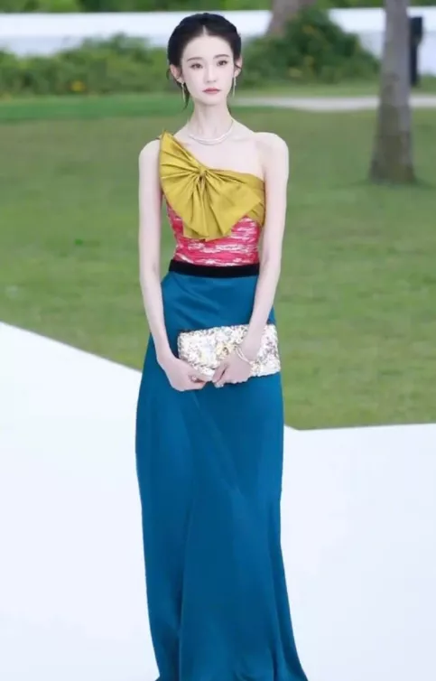 全身上下没有一丝胶原蛋白的感觉,偏偏还选了斜肩礼服,脖颈、手臂看起来就像个衣服架子。