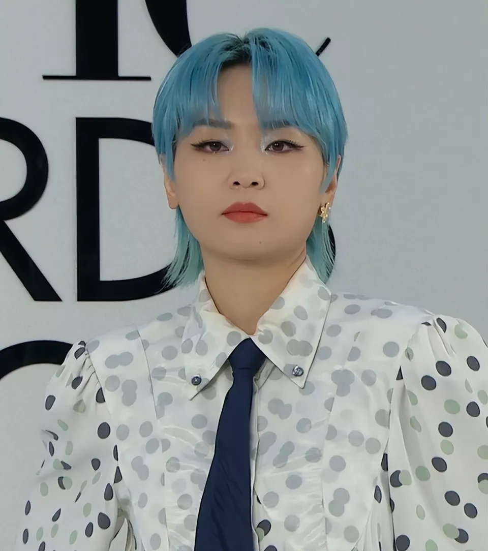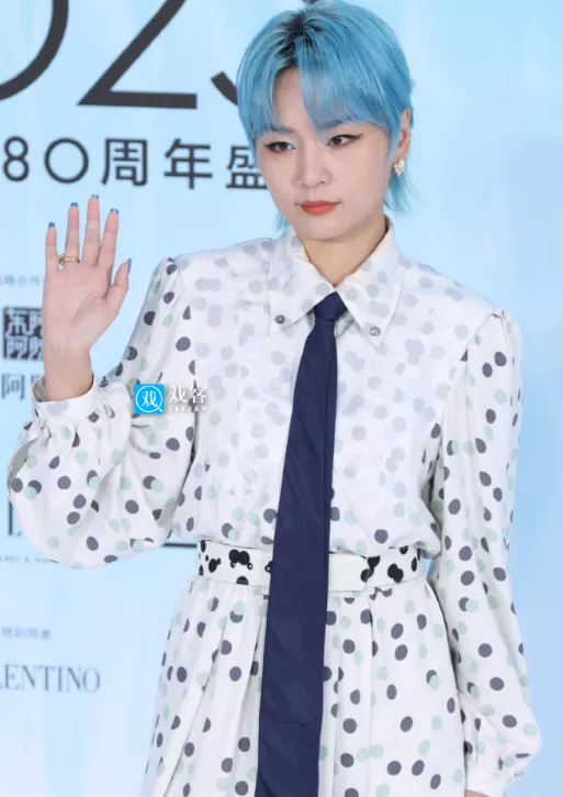 她的鸳鸯蓝发色,与波点套装倒是有些呼应。