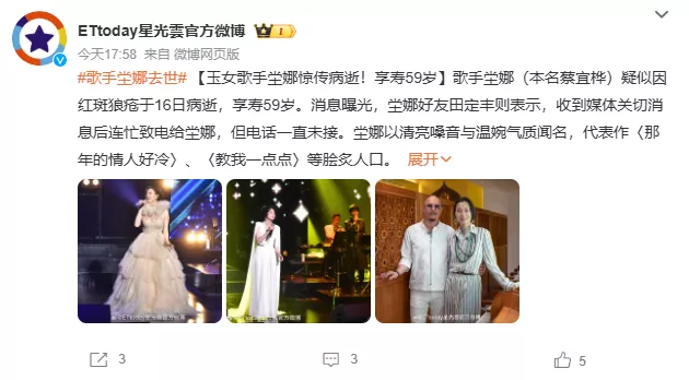 据台媒10月29日报道,台湾知名歌手坣娜因红斑狼疮旧疾复发,已于10月16日去世,终年59岁。