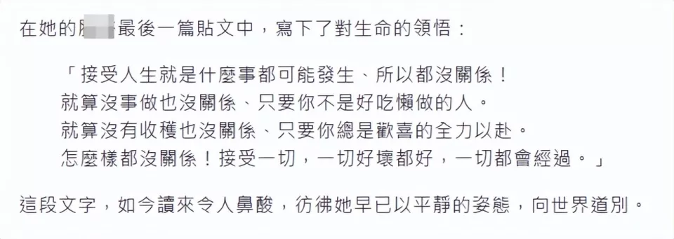 她生前最后一次发文写下对生命的感悟。