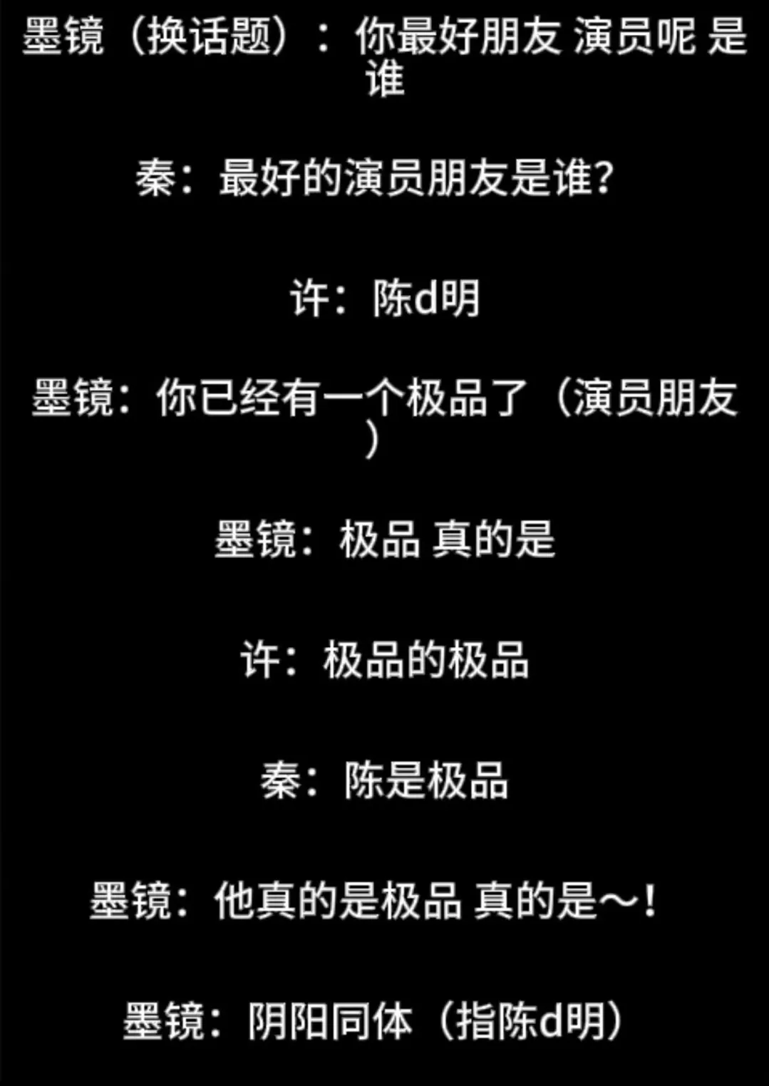 更绝的是,秦雯一面说陈道明是自己圈内最好的演员朋友,一面各种吐槽陈道明,说他爱现场改词,改完又记不下来,王家卫又接话,说他是极品,秦雯跟她的助手也认同,说陈道明确实是极品,这还不够,王家卫又说陈道明是“阴阳同体”。