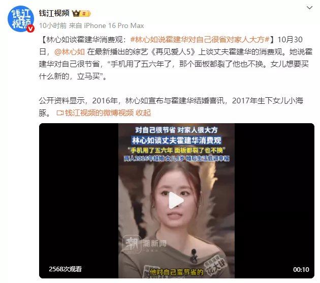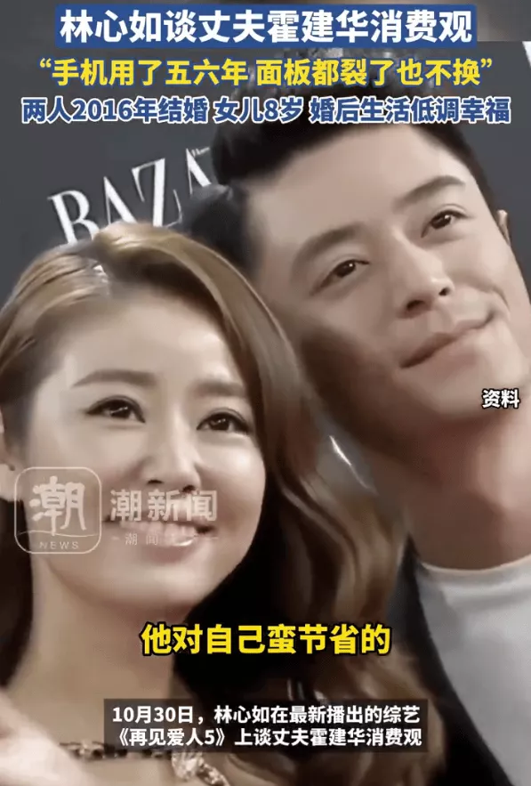 10月30日,林心如在最新播出的综艺《再见爱人5》上谈丈夫霍建华的消费观。她说霍建华对自己很节省,“手机用了五六年了,那个面板都裂了他也不换。女儿想要买什么新的,立马买。”