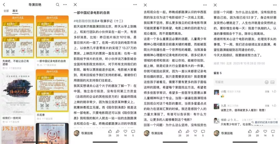 导演田艳和团队并没有放弃,他们从电影上映之前就开始争取更多的排片场次。影片上映之后,田艳持续跑路演,她在路上写下了文章《一部中国纪录电影的自救》,继续为影片能让更多观众看到而奔波。