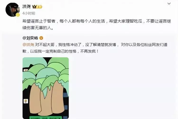 结果引发轩然大波,于正亲自出面澄清洪尧是正常邀约庆生。眼看事情闹到这个地步,刘奕畅随后发布微博道歉,声称是自己性格太冲动,没把事情了解清楚,以后会克制自己。