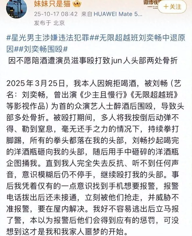 10月17日,一篇长文在网络上引起了轩然大波。撰写人是现役军人梁先生,他在长文中表示,在去接未婚妻下班时,遭到刘奕畅等人的强行劝酒。