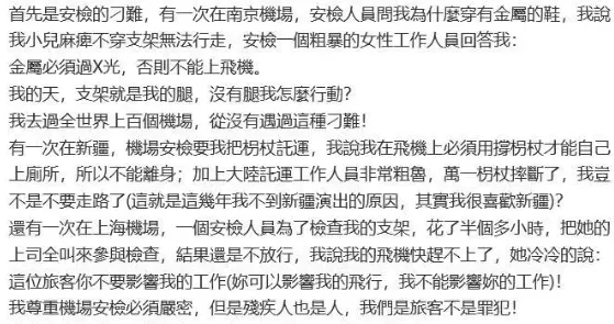 他指出曾多次在安检环节中,因工作人员的教条、死板的操作流程,感到失望、气愤。