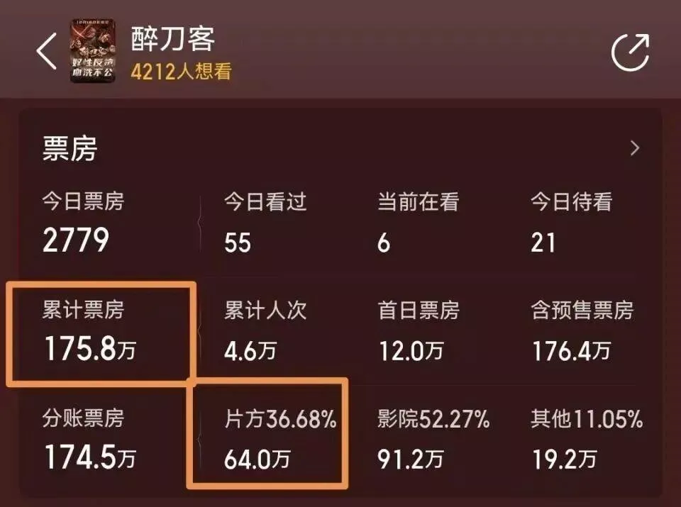 《醉刀客》首映全国电影院给排了1632个场次,排片占比仅1%,第二天便下降到616个场次,上映首日票房12万,目前176万,太惨了!