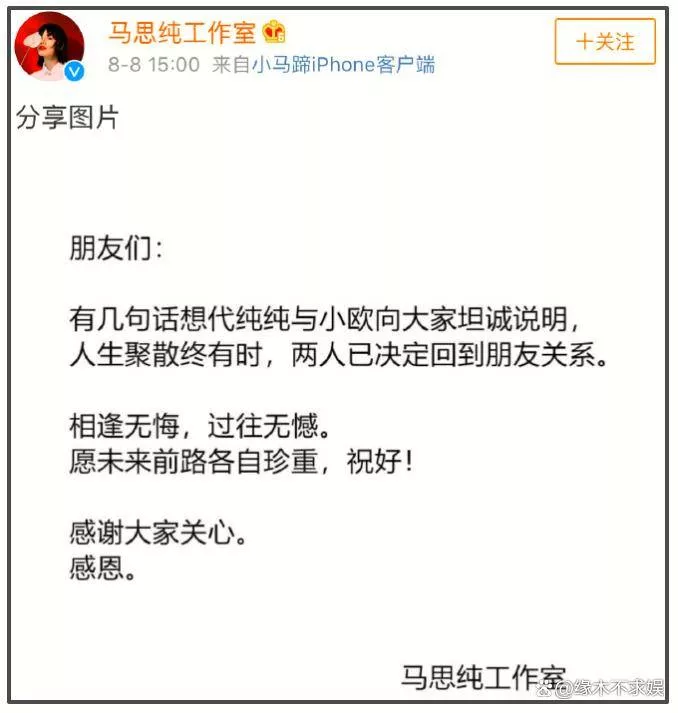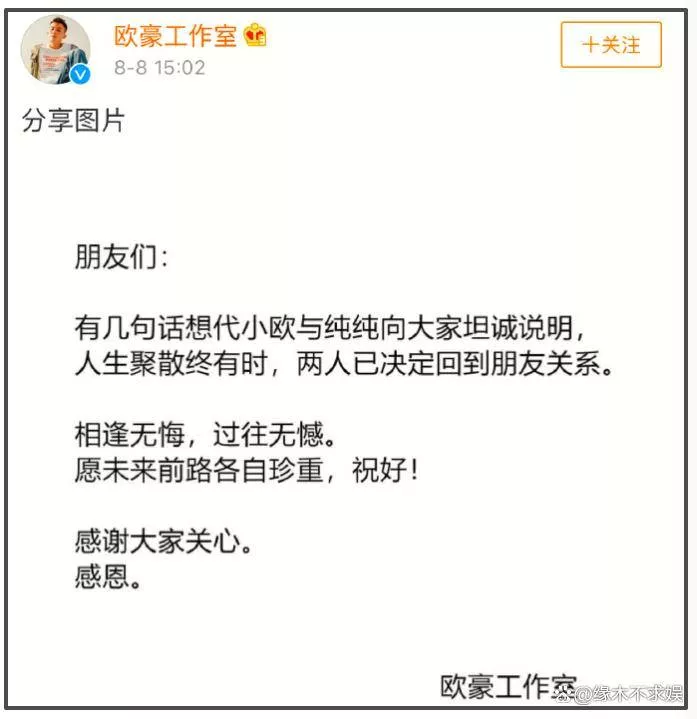 2018年8月,欧豪和马思纯工作室双双宣布分手,结束了这段维系数年的甜蜜恋情。分手后,马思纯开启了新的感情生活,二人再无交集。这次微博视界大会,二人各自带着新作亮相,作为青年演员被安排坐在同一排。