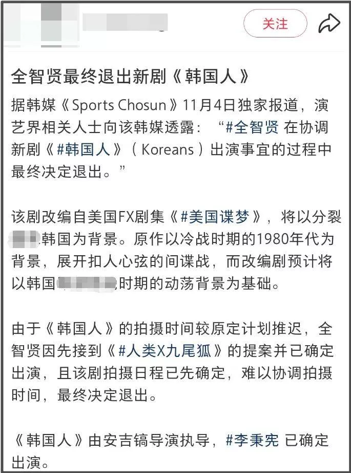 目前《人类X九尾狐》确认了拍摄时间,计划2026年3月开机,而《韩国人》拍摄延迟了,两部剧档期相撞,全智贤选择退出《韩国人》。