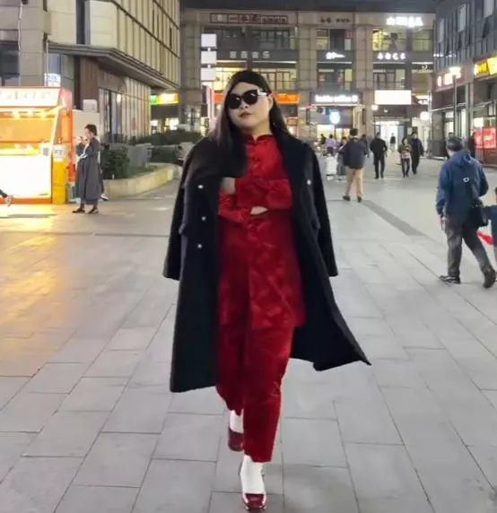 反观这位网红身上所穿的衣服,很明显就是再普通不过的红色睡衣。