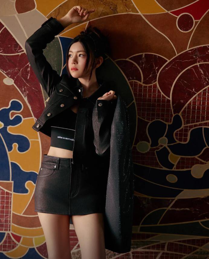 她为了自己显得比例更好一点,就在里面搭配了一件很短的黑色运动内衣。