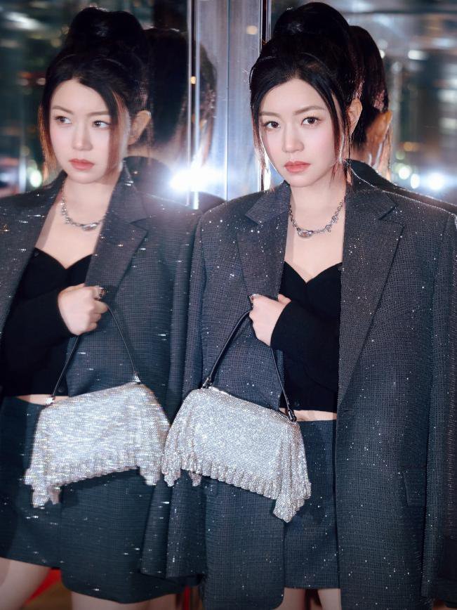 除此之外,她还在外套里面穿了一件黑色的低领抹胸,手上拎着一个银色的亮钻包。
