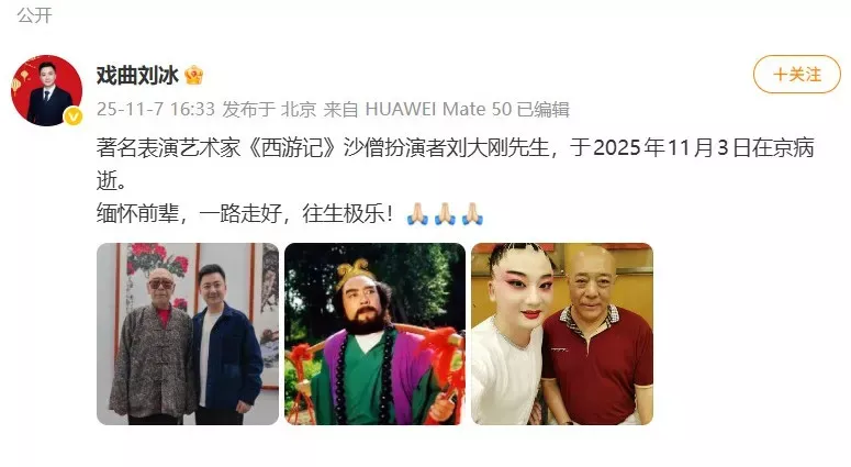 11月7日,戏曲演员@戏曲刘冰 发文称:“著名表演艺术家《西游记》沙僧扮演者刘大刚先生,于2025年11月3日在京病逝。”