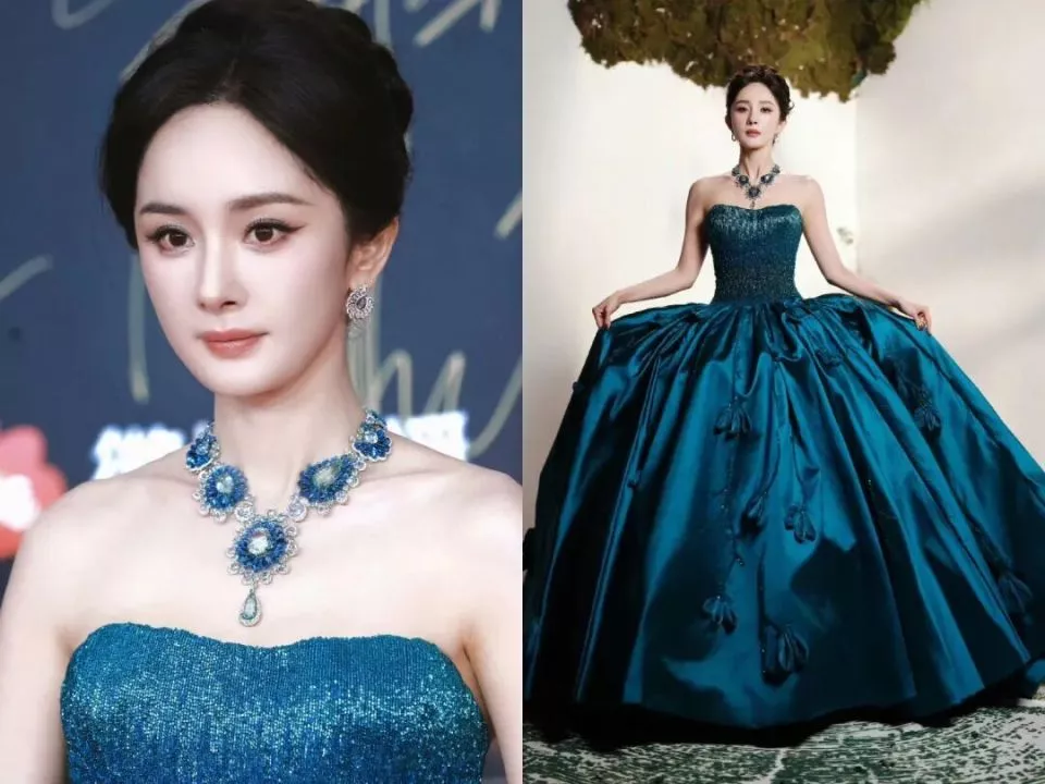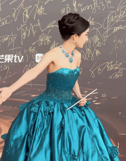 一身蓝孔雀高定礼服,把“姐就是女王”的气质展现的淋漓尽致。