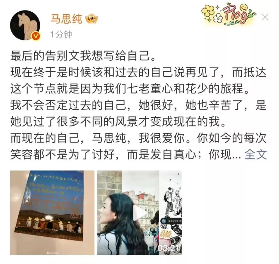 她在《花少7》里告别文是这么写的:我不会否定过去的自己,她很好,她也辛苦了,是她见过了很多不同的风景才变成现在的我。