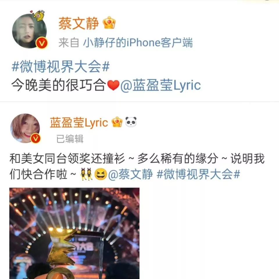 最后,当晚最尴尬的瞬间,莫过于蔡文静与蓝盈莹的撞衫。