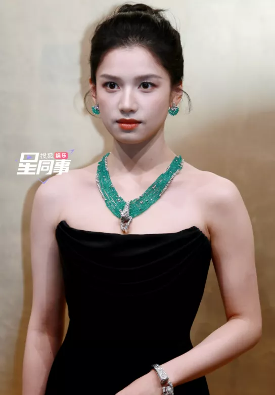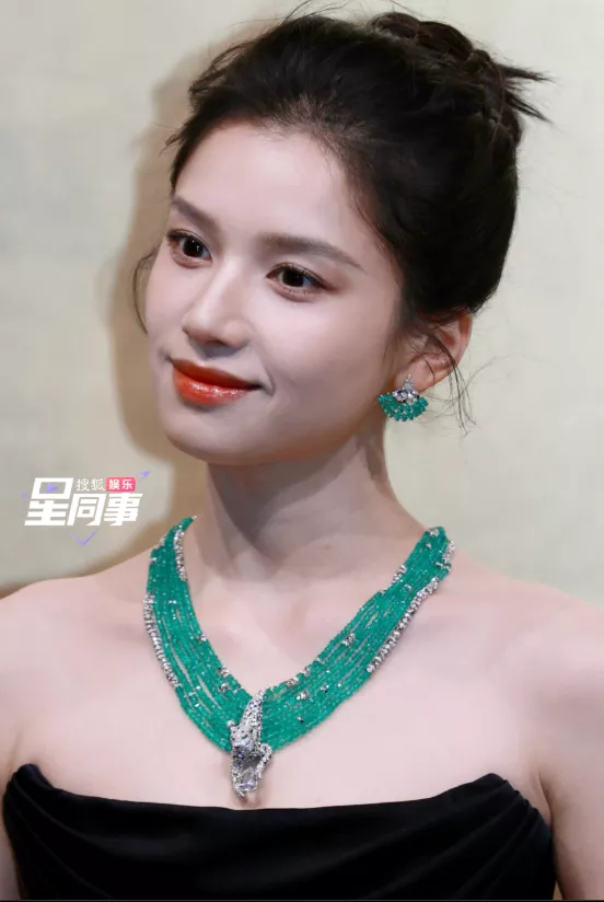 搭配翠绿色的高级珠宝首饰和高盘发,张婧仪的身上展现出了豪门大小姐的矜贵与傲气。
