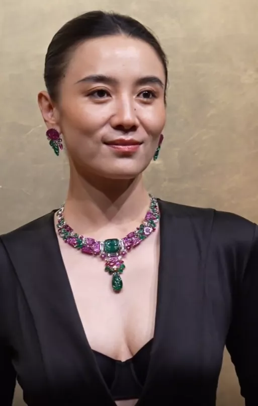 大粉大绿的钻石项链颜色看起来夸张艳俗,但宋佳却完美的驾驭住了这套珠宝。