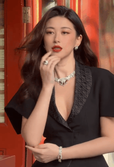 宛如皇冠的钻石项链贵气拉满,深V衣领下的事业线更是抢眼。