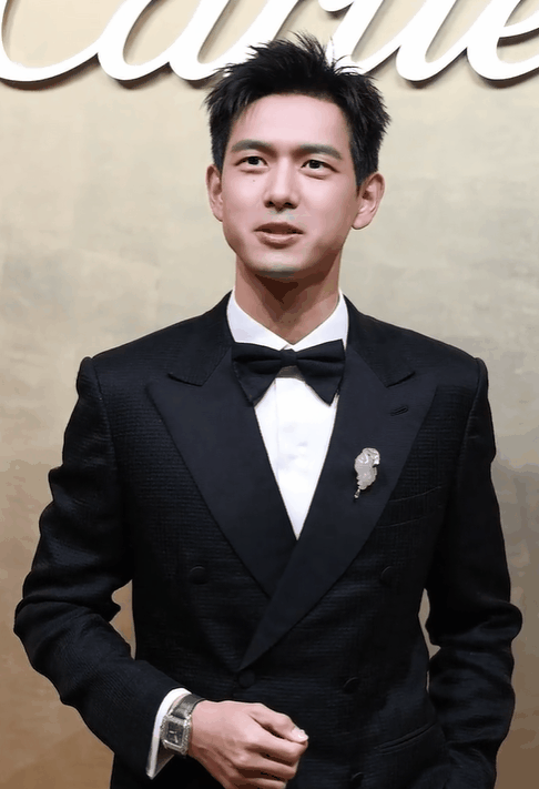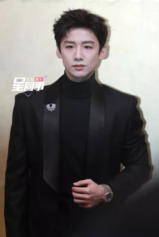 比如白敬亭这身黑色西装搭配同色系高领针织衫,领口处的蓝色钻石胸针冲淡了黑色造型的沉闷感,手腕上银色皮带的腕表同样是点睛之笔。