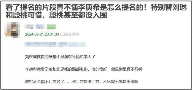 有网友表示可能这是在鼓励年轻人进步,给年轻人留机会。殷桃都已经拿过奖了,不能二封视后。但网友表示就算要卡二封,也不能连提名都没进去,她的实力观众有目共睹,没提名真是可惜。