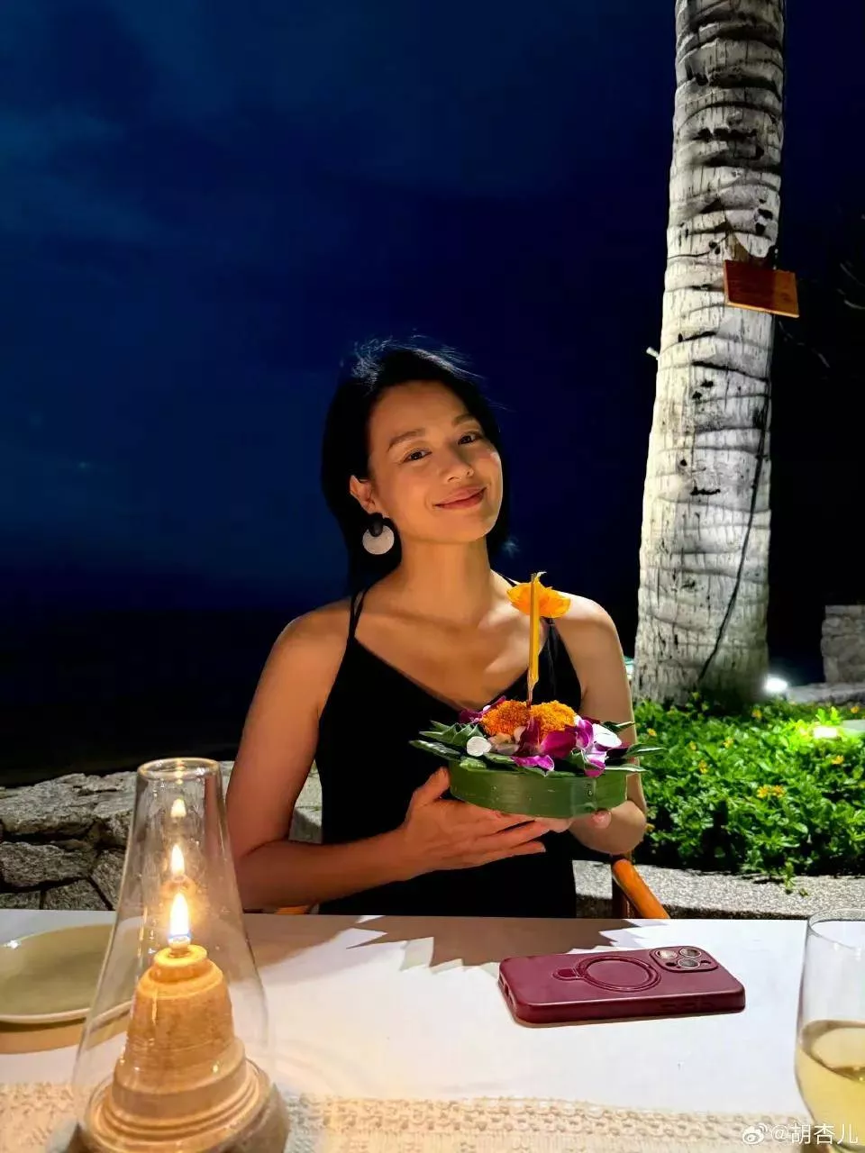 在照片中,胡杏儿穿着一条黑色吊带长裙,展现了她度假风的温柔与女人味。李乘德则穿着一件白色衬衫和灰色长裤,整体造型休闲又自在,完全散发着轻松的氛围。两人在海边享受着浪漫的烛光晚餐,整个场景洋溢着温馨与惬意,浪漫氛围十足。