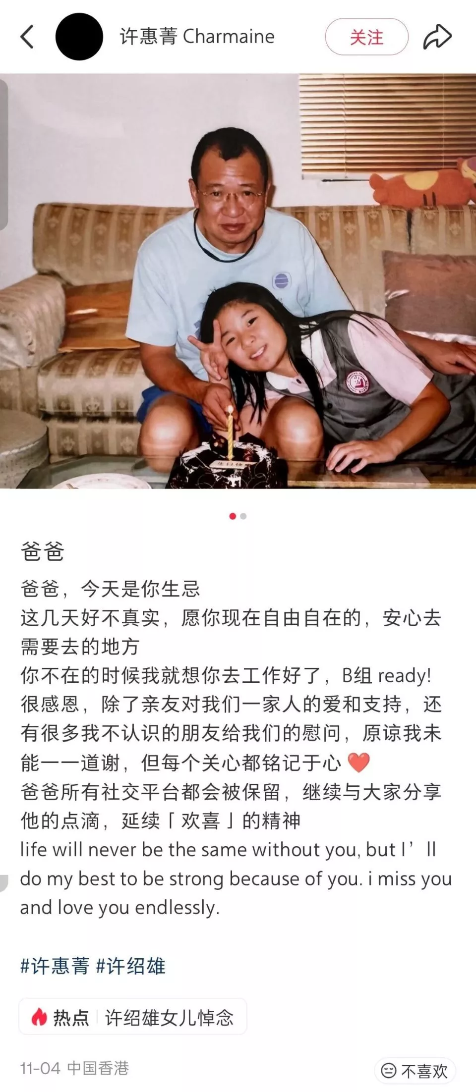 在许绍雄去世后第7天,许惠菁在社交媒体上发文悼念父亲道:“爸爸,今天是你生忌。这几天好不真实,愿你现在自由自在的,安心去需要去的地方。你不在的时候我就想你去工作好了,B组