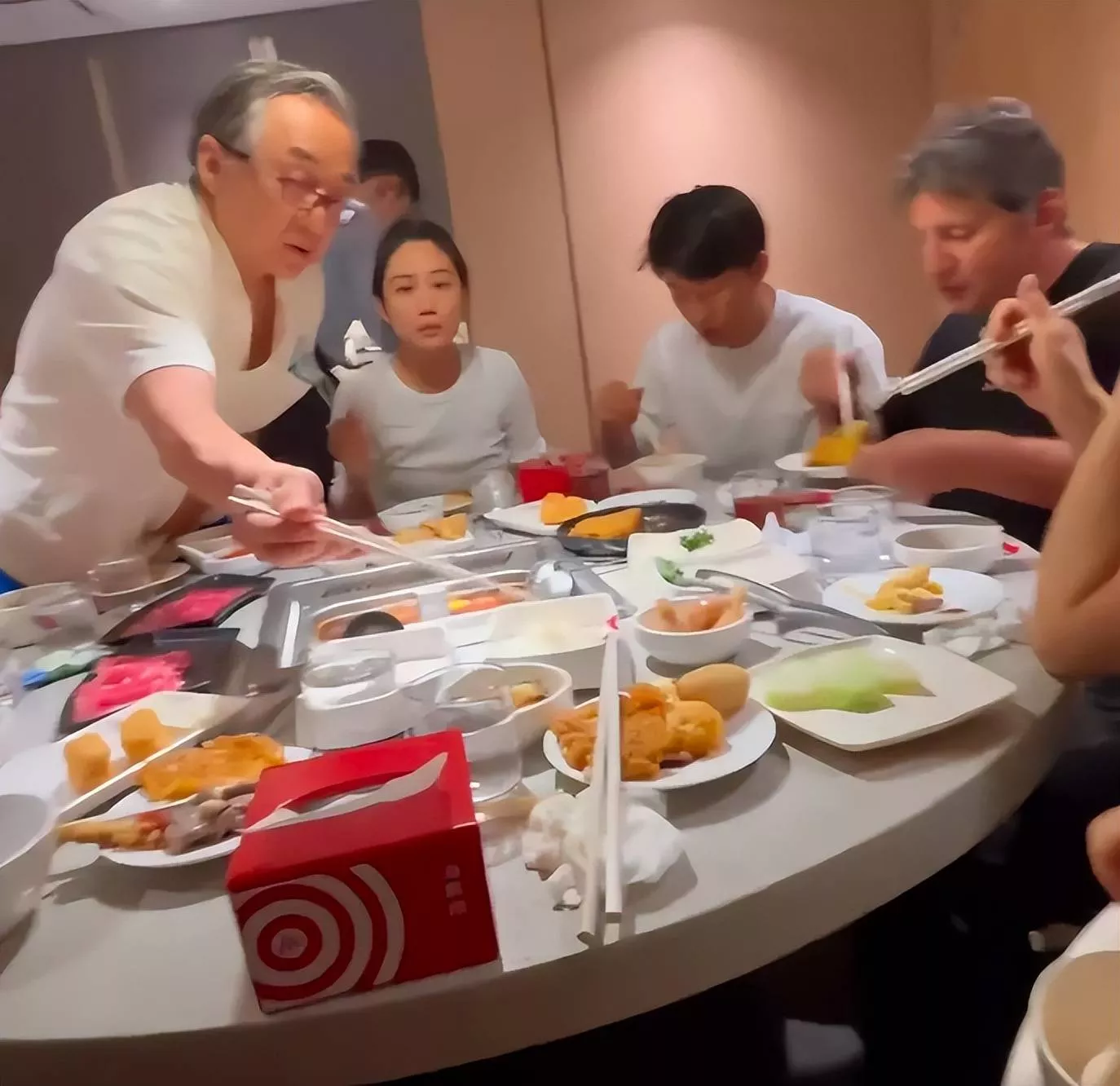 之后的成龙在加拿大餐厅吃饭被网友拍到,当天的他穿着白色衬衫,脸上带着老花镜,已经是退休老大爷的年龄状态了,虽然身边围绕了一桌子吃饭的年轻人,但他仍旧亲自给小辈夹菜。