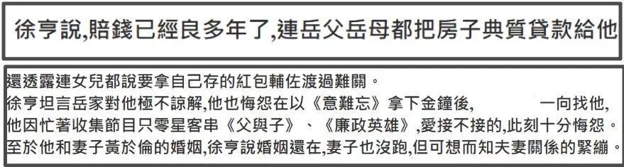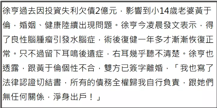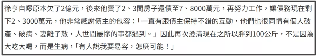 还好,徐亨还算有担当,很明显,声称因性格不合离婚,是徐亨努力保留的最后一点体面,中年夫妻无法走下去,多半是因为还不完的债,离了婚的徐亨直接净身出户,同时强调由他一人承担所有债务——此时徐亨还有2亿台币欠债没还,也就是4000多万人民币。