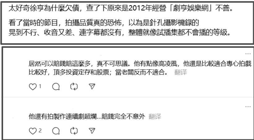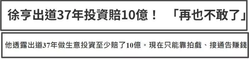 然而很多时候,一个人的人生转折点就在于“走出舒适区”——徐亨出道小40年,反反复复累积下来,竟然欠下10亿台币债务,折合成人民币也有2亿多,全是因为他盲目投资。