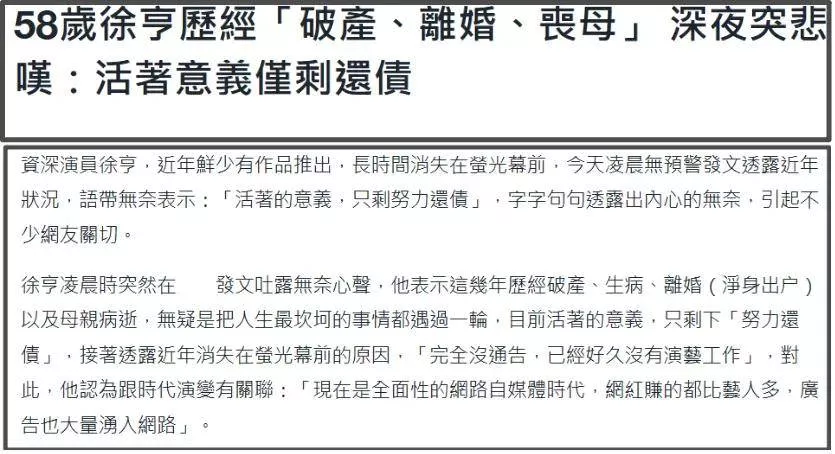 最近徐亨在社媒自曝近况,直言自己活得很累,人生所有坎坷事都让他遇上了,中年失婚又丧母,破了产又得了病,如今活着的意义只剩努力还债。