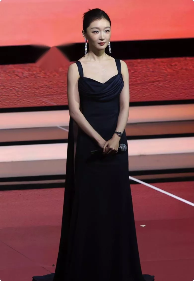 她穿的那条黑色披肩礼服并不复杂,却像是为她量身定制一样,把她的气质推向一个更成熟、更从容的层级。