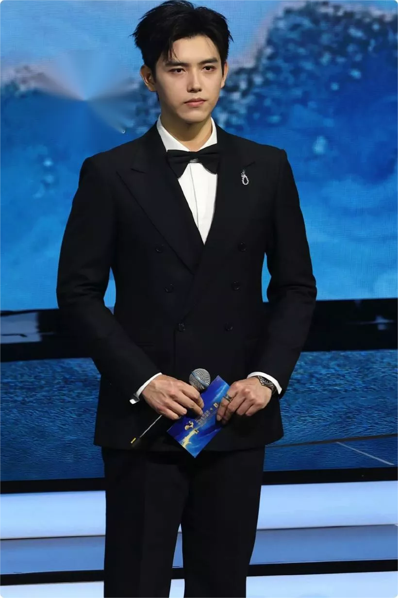 他那身黑色西装把身材比例衬得既挺拔又干净,加上他的少年感和清爽气质,镜头扫过去的时候非常舒服。