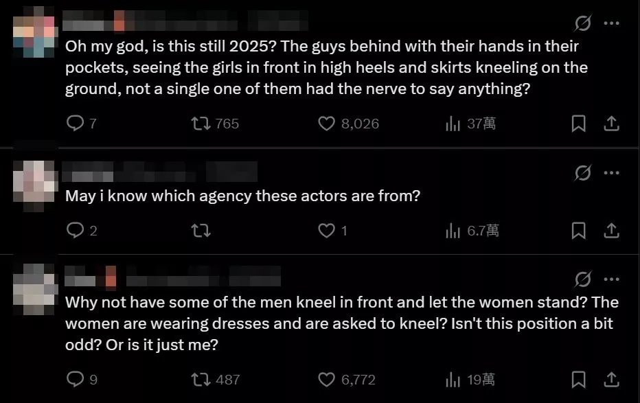 此合照安排让网友看不下去,纷纷在社群平台上发表看法,怒轰这种做法对女性极不尊重,更有人要求男演员们出面道歉,也有人傻眼表示: