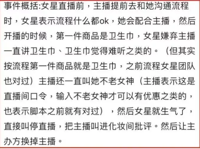 2021年的一次直播中,由于被男主播以“不老女神”称呼多次,引发不满,还直接要求暂停直播,并在化妆间与之理论。