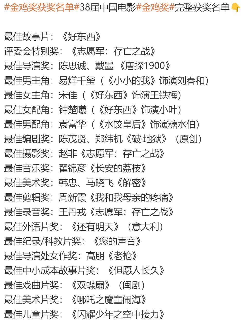最后附上今年金鸡奖的获奖名单,以结果来看含金量跟前几年保持着差不多的水平——有让人满意的部分,但整体难以服众。