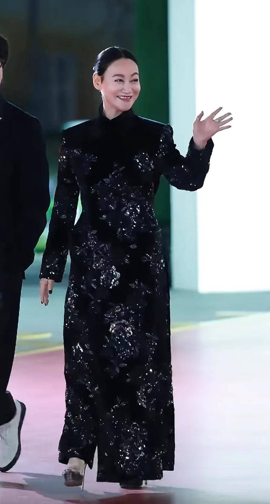 比叶童稍年长一点的惠英红,选择了一套新中式刺绣礼服,这一套更有秋冬的感觉,看着比较保暖。